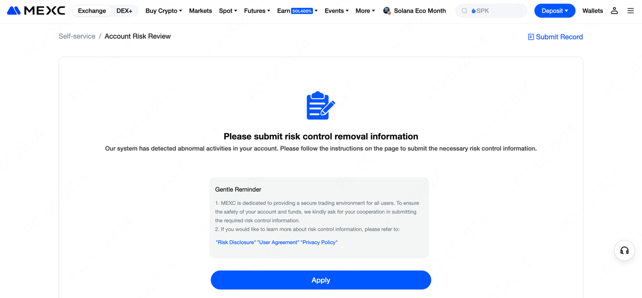 Si tu cuenta ha sido marcada por el sistema de control de riesgos y está sujeta a restricciones, sigue las instrucciones a continuación para enviar los documentos requeridos y completar el proceso de Si tu cuenta ha sido marcada por el sistema de control de riesgos y está sujeta a restricciones, sigue las instrucciones a continuación para enviar los documentos requeridos y completar el proceso de
