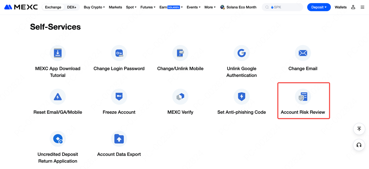 Ve a la Página principal oficial de MEXC → Haz clic en Centro de ayuda → Selecciona Revisión de riesgos de la cuenta → Procede al portal de envío de documentos.