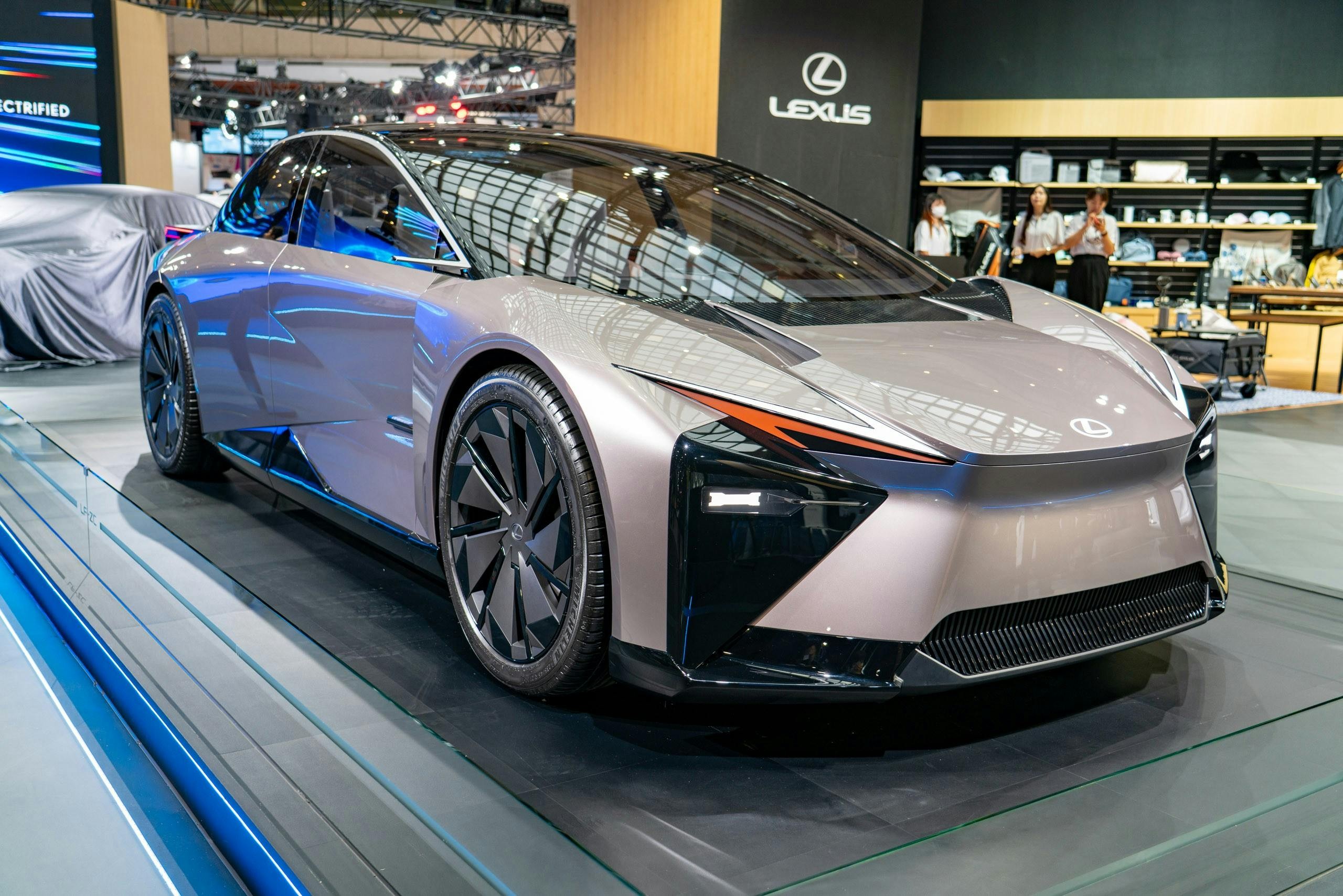 雖然 RZ 550e 被擺在角落,但是考量到上市時有媒體報導被炎上,導致車輛造成負面印象,在風口浪尖上的 RZ 550e,很可惜只能默默的在一旁陪坐,但展場舞台上的 ES 500e、展區正中央的概念車 LF-ZC,都象徵著 Lexus 的純電想像。