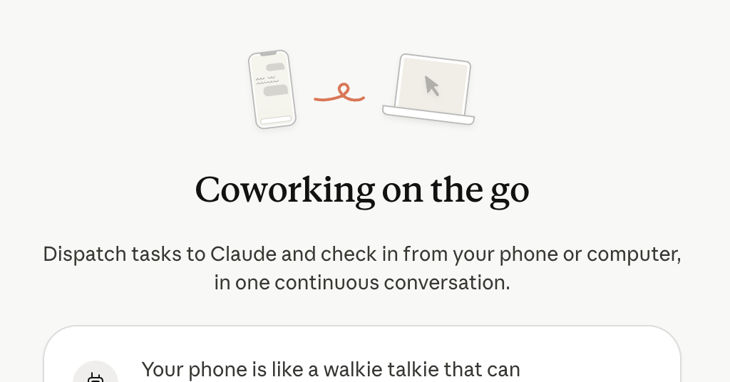 Anthropic 在 3 月 17 日推出了 Claude Dispatch,做的事情很簡單,讓你用手機傳訊息給 Claude,它直接在你的電腦上把事情做完。Anthropic 在 3 月 17 日推出了 Claude Dispatch,做的事情很簡單,讓你用手機傳訊息給 Claude,它直接在你的電腦上把事情做完。